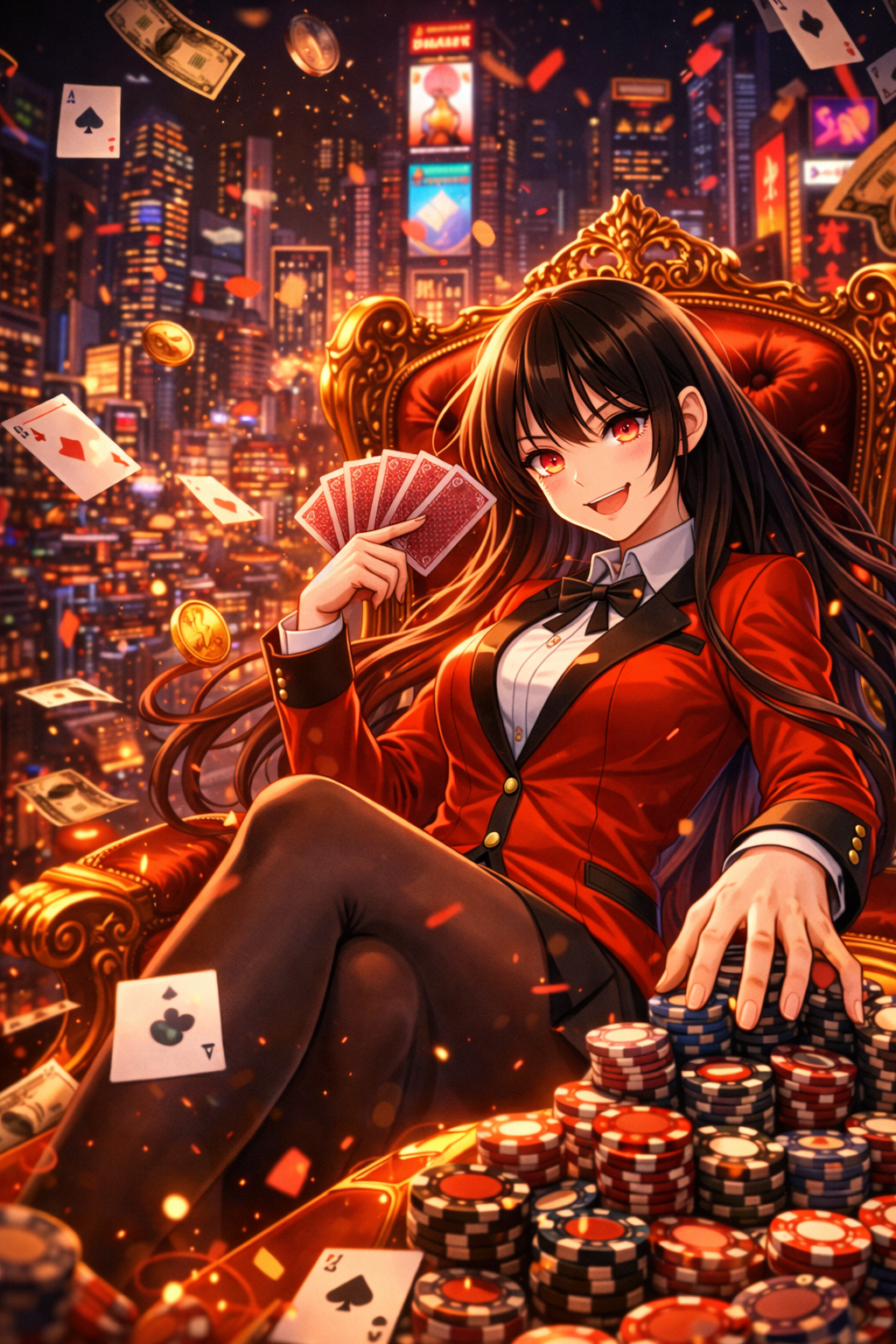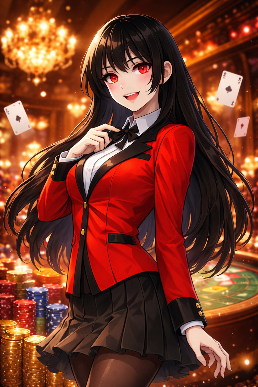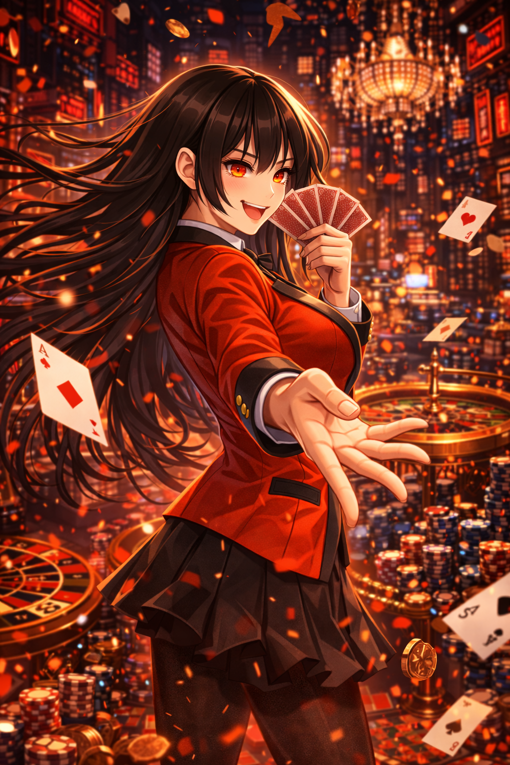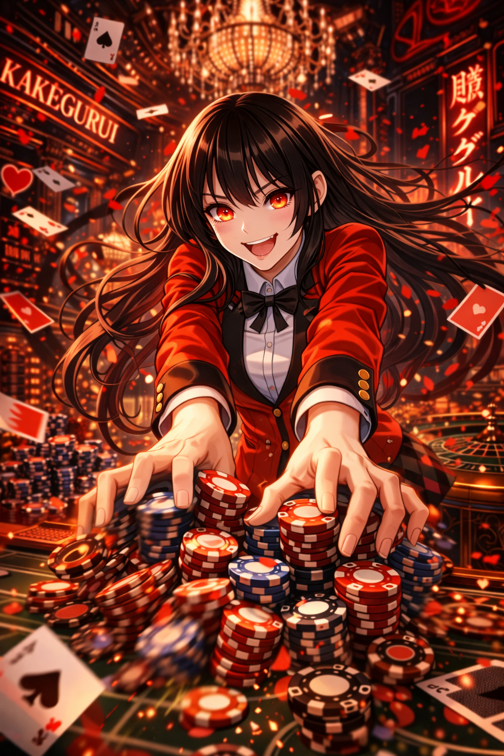 Yumeko Jabami (蛇喰 夢子) is the main protagonist of Kakegurui - Compulsive Gambler. She's a second-year transfer student at Hyakkaou Private Academy and the classmate of Ryota Suzui and Mary Saotome. Yumeko is a member of the family of Kirari Momobami that challenges her for Hyakkaou Private Academy.